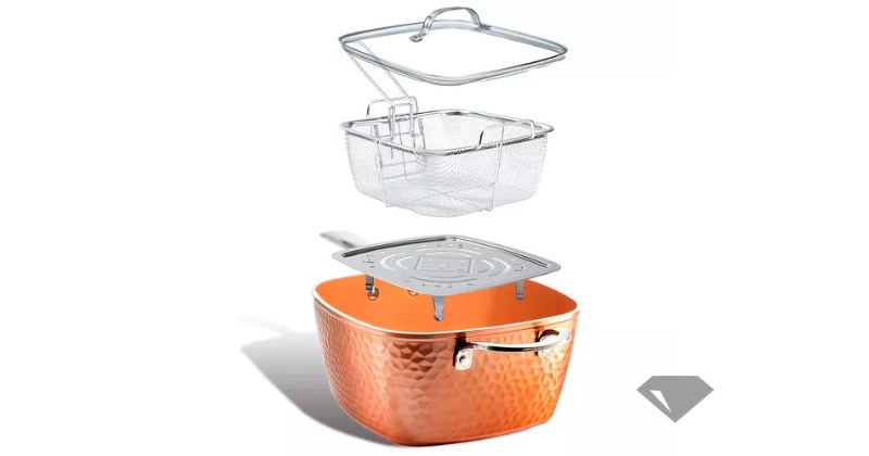 Una sartén profunda con recubrimiento antiadherente de cobre martillado, que combina estética y rendimiento en cada preparación. Perfecta para saltear, freír o cocinar a fuego lento, siendo un imprescindible en cualquier cocina moderna.