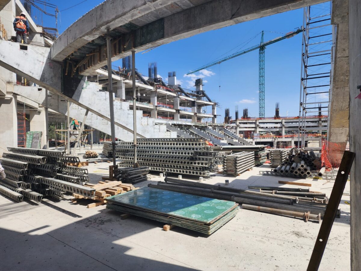 Como se ha mencionado, la zona de graderío está al 80% casi terminada. También se indica que se emplean 1,500 toneladas de para brindar aire fresco y acondicionado al espacio. Se utilizan 11 mil metros de tubería instalada en el sistema de aire acondicionado y 192 toneladas de lámina para los ductos.