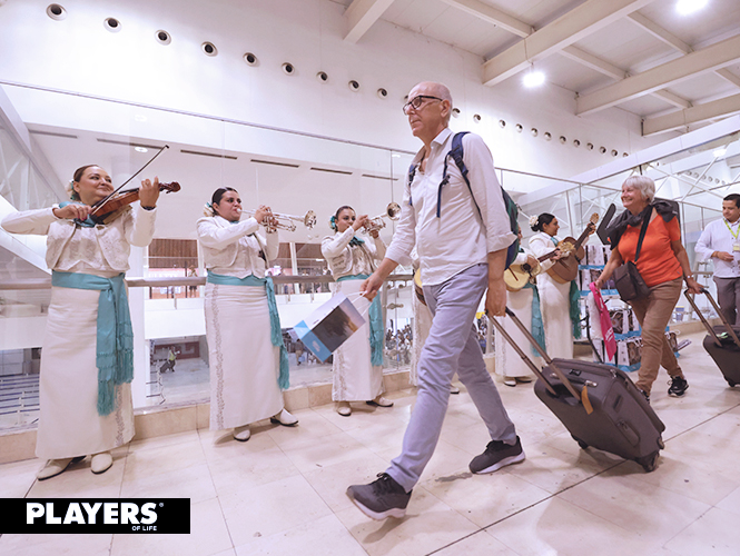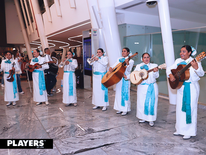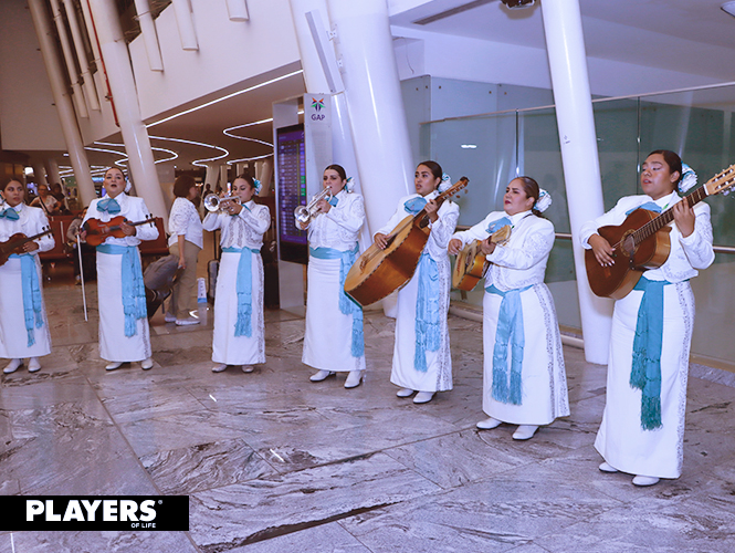 Un mariachi y la leyenda Welcome to Guadalajara recibieron a los pasajeros que hicieron este recorrido por primera vez, y posteriormente, ese mismo mariachi femenil les diría hasta luego a aquellos pasajeros que estrenarían la ruta Guadalajara-Vancouver.