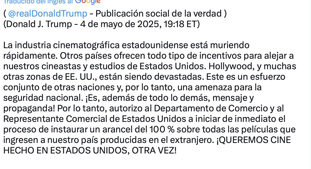 Aunque aún no se ha detallado cómo se aplicarían los nuevos aranceles, la intención es clara: frenar la producción fuera del país y favorecer que los grandes estudios regresen a filmar en suelo estadounidense, en medio de una industria que ha enfrentado pandemia, huelgas y caída en la producción.