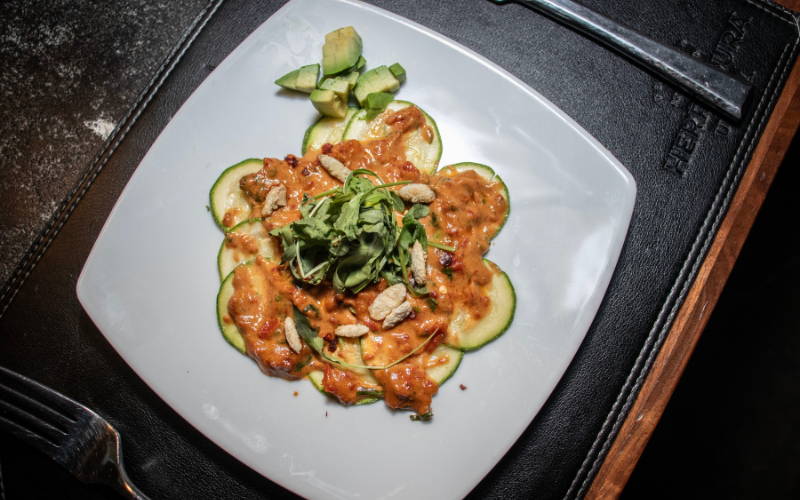 La cena inició con un carpaccio de calabaza, acompañado por un Chardonnay de Don Leo. Esta primera etapa marcó el tono de la experiencia, con un platillo ligero y un vino pensado para abrir el paladar. Desde el arranque, el formato permitió que los asistentes entendieran el orden y la intención detrás de cada maridaje.