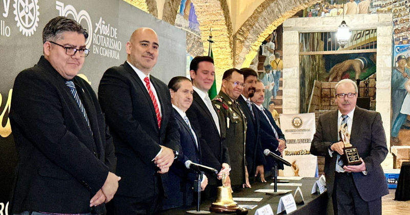 El Club Rotario de Saltillo celebró su centenario reconociendo a ciudadanos ejemplares, entre ellos al político y diplomático Enrique Martínez y Martínez, quien ha ocupado cargos clave como Gobernador de Coahuila, Secretario de Agricultura y Embajador de México en Cuba. Acompañado por su familia, recibió la presea conmemorativa como símbolo de gratitud y respeto por su legado al servicio público.
