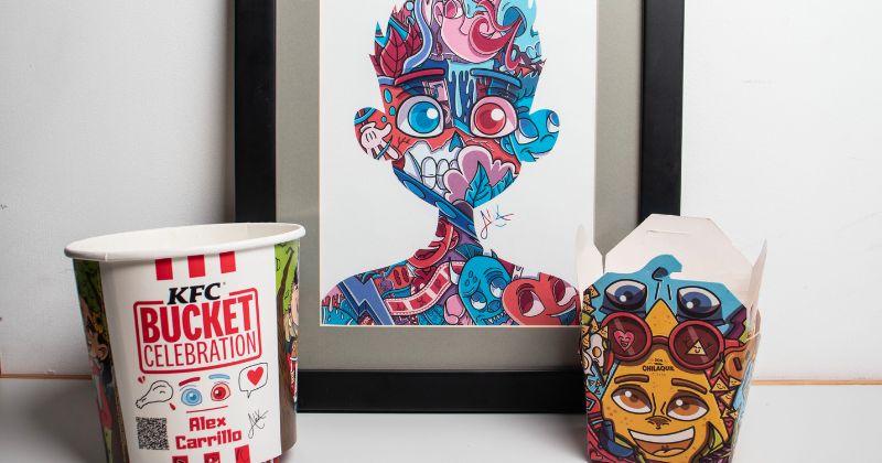Esa identidad visual lo ha llevado a colaborar con marcas como KFC y Don Chilaquil, reinterpretando productos icónicos con total libertad creativa.